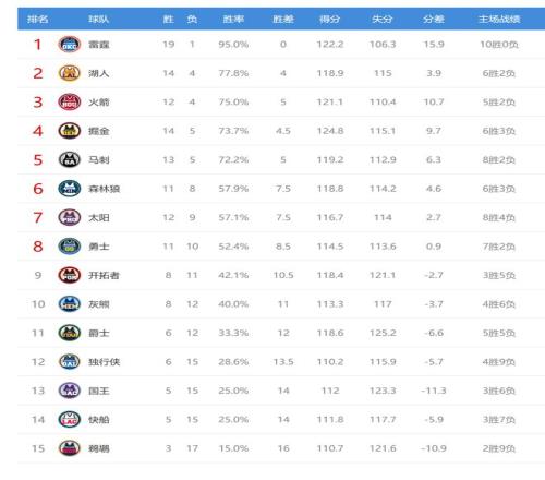 快船输球后5胜15负,排名从西部第12掉到第14,独行侠赢球后6胜15负,排名从西部第14升到第12。