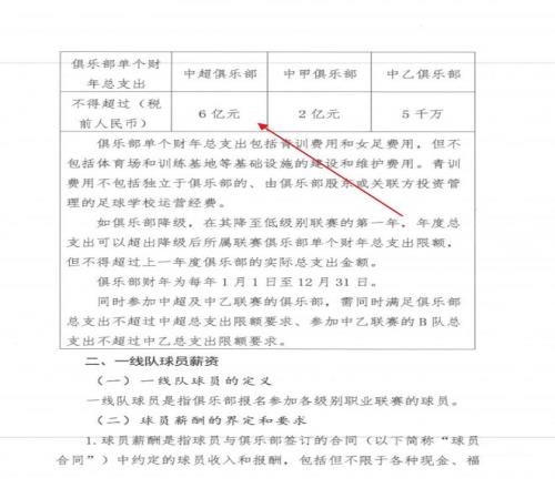 先来看一下大家比较关心的两个点:1,中足联规定:中超俱乐部在“单个财年”的投资上限是6亿元人民,中甲俱乐部上限是2亿元人人民币,乙级俱乐部的上限是5000万人民币。