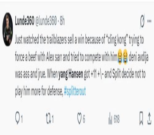 赛后开拓者球迷、开拓者媒体、美国媒体都为杨瀚森此役的表现点赞:克林根与萨尔发生了一次冲突导致球队的胜利溜走,而杨瀚森在场+11明显更出色,可斯普利特却不让他在关键时刻参与防守。