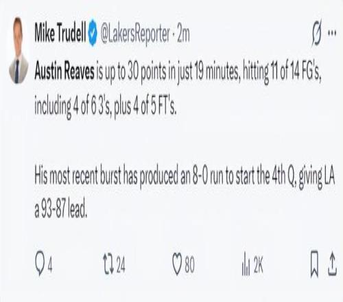 奥斯汀-里夫斯实在是太出色了,末节开场湖人还在落后,但在短短1分06秒的时间里里夫斯一人打出了8-0的攻势直接帮助湖人反超,湖人队记迈克-特鲁戴尔都觉得不可思议。